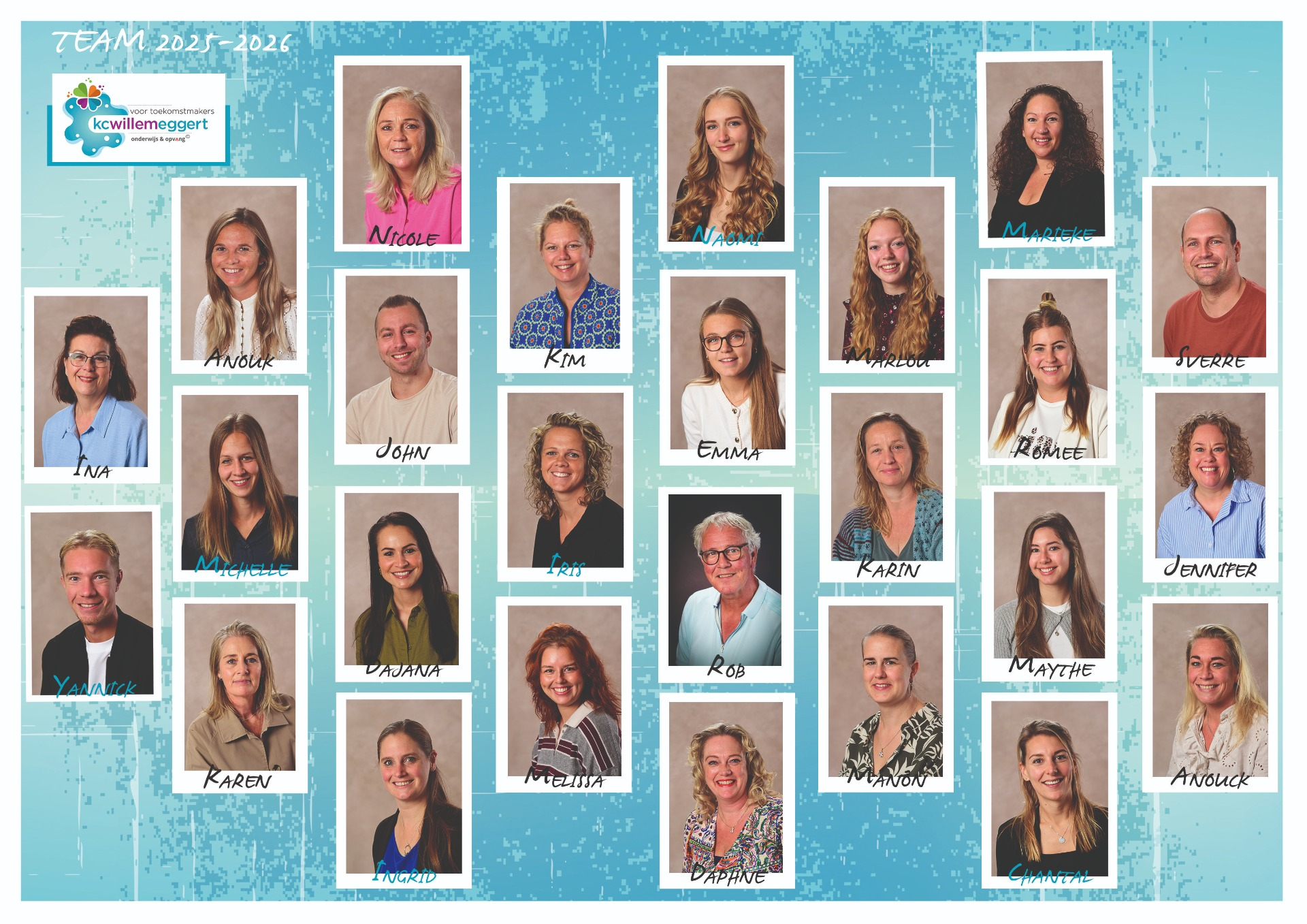 Binnen het Kindcentrum werken pedagogisch medewerkers, leerkrachten en ondersteuners op professionele wijze samen aan de ontwikkeling van onze kinderen.Ons team is opgebouwd uit: